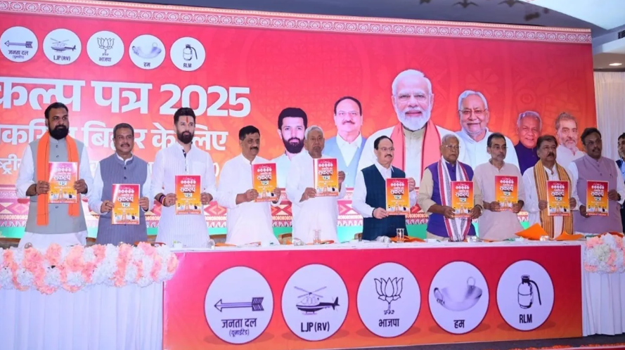 बिहार विधानसभा चुनाव से पहले एनडीए ने अपना घोषणा पत्र ‘संकल्प पत्र’ जारी कर दिया है, जिसमें रोजगार, महिला सशक्तिकरण और कृषि विकास को प्रमुखता दी गई है। गठबंधन ने एक करोड़ से अधिक रोजगार देने, हर जिले में मेगा स्किल सेंटर खोलने और किसानों को सालाना 9,000 रुपये की सहायता देने का वादा किया है। मुख्यमंत्री नीतीश कुमार और भाजपा अध्यक्ष जेपी नड्डा ने पटना में इस संकल्प पत्र को जारी किया। इसमें अतिपिछड़ा वर्ग के लिए 10 लाख रुपये की आर्थिक सहायता और कृषि इंफ्रास्ट्रक्चर में 1 लाख करोड़ रुपये निवेश की घोषणा की गई है। धान, गेहूं, दलहन और मक्का की एमएसपी पर खरीद पंचायत स्तर पर होगी। महिलाओं के लिए ‘मुख्यमंत्री महिला रोजगार योजना’ के तहत 2 लाख तक सहायता दी जाएगी। 1 करोड़ महिलाओं को ‘लखपति दीदी’ बनाने का लक्ष्य रखा गया है। 7 एक्सप्रेसवे, 4 मेट्रो शहर और ‘न्यू पटना’ जैसे ग्रीनफील्ड सिटी की योजना भी शामिल है। औद्योगिक मिशन के तहत बिहार को ग्लोबल स्किलिंग और टेक हब बनाया जाएगा। 125 यूनिट मुफ्त बिजली, 5 लाख तक मुफ्त इलाज और 50 लाख पक्के मकान का वादा किया गया है। शिक्षा, स्वास्थ्य, उद्योग, खेल और संस्कृति में व्यापक बदलाव की रूपरेखा के साथ एनडीए ने बिहार के विकास का रोडमैप पेश किया है।