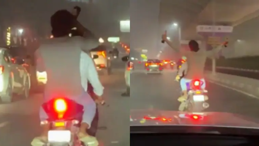 इस घटना का वीडियो पीछे चल रही एक महिला ने अपनी कार से रिकॉर्ड किया। बताया जा रहा है कि जब महिला युवकों के करीब पहुंची और वीडियो बनाने लगी, तो दोनों ने और भी खतरनाक स्टंट करना शुरू कर दिया। पीछे बैठा युवक बोतलें लहराने लगा और कैमरे की ओर देखकर शराब पीने लगा।